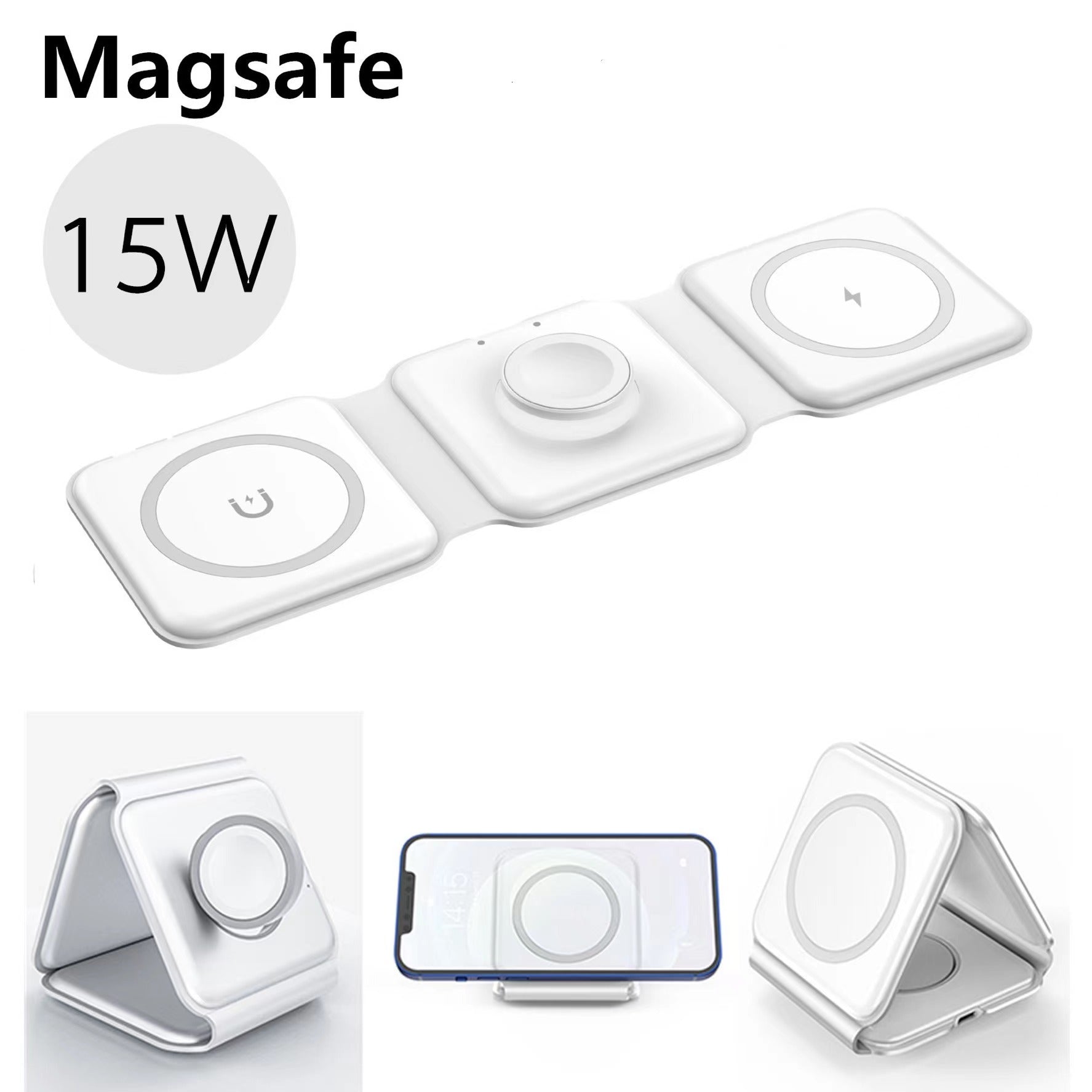 Experience the ultimate in convenience with our 3 in 1 Wireless Charger for Apple Devices. This magnetic, foldable charging station not only charges your iPhone 15/14/13/12, AirPods Pro 2/Pro/3, and iWatch simultaneously, but it's also small enough to take on your travels. Say goodbye to tangled cords and hello to effortless charging with our premium device.